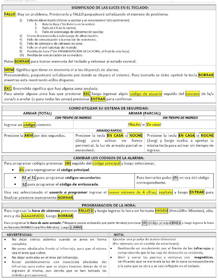 Significado de las luces en el Teclado | Armar (Total o Parcial) | Armado Rápido | Cambiar Códigos | Programar hora